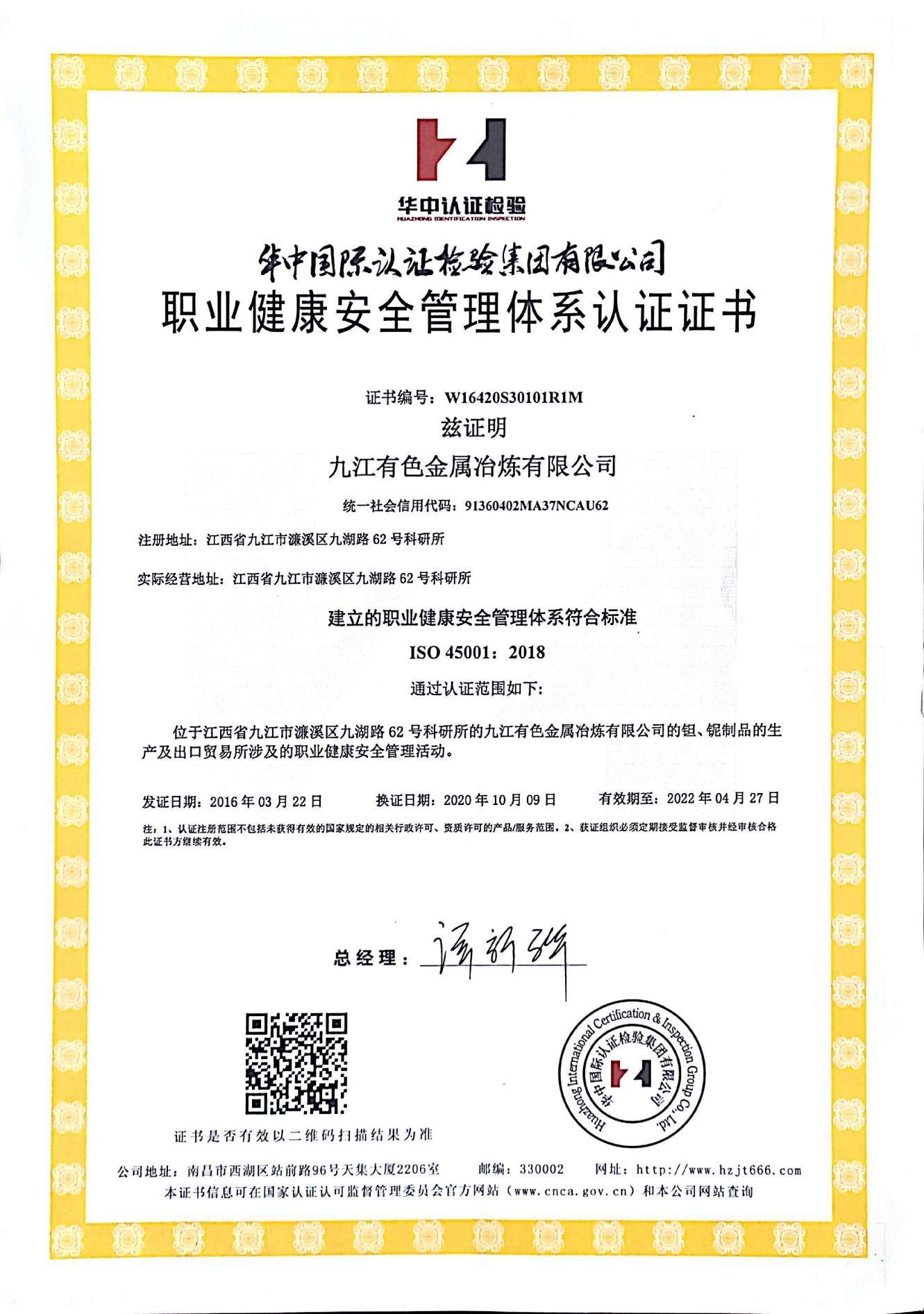 : 职业健康安全管理体系认证证书