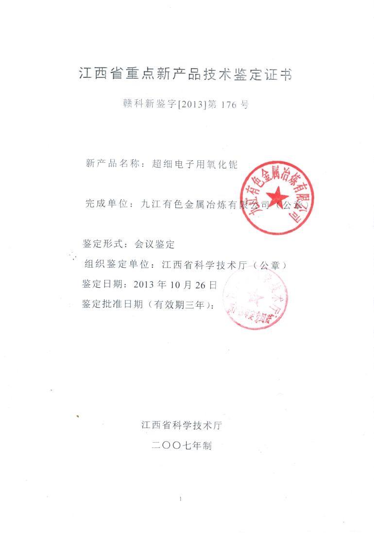 : 江西省重点新产品技术鉴定证书——低N高纯氧化钽