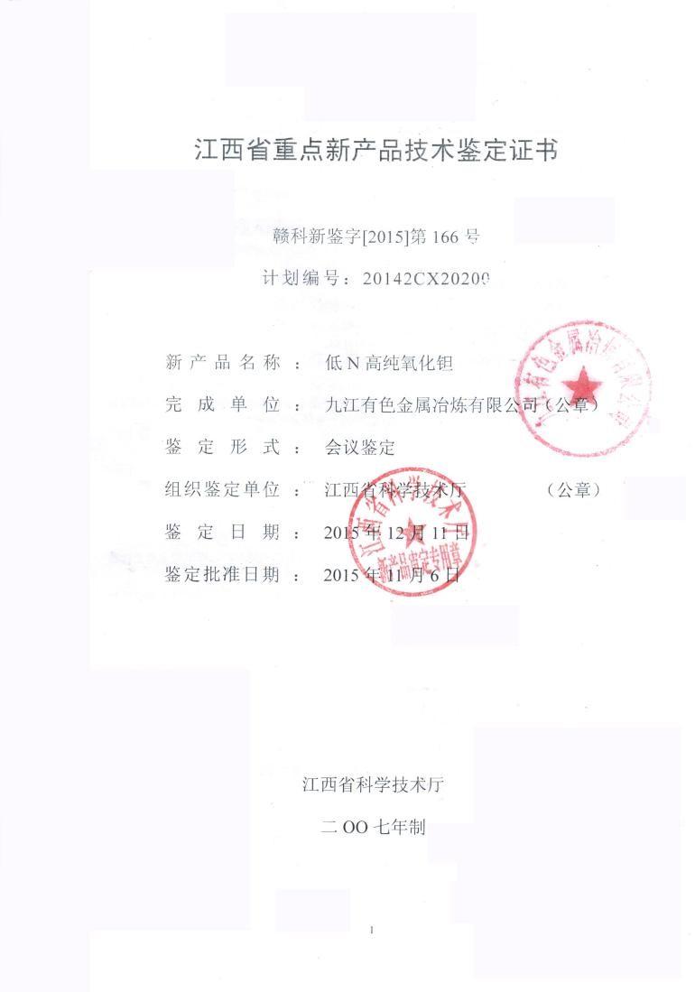江西省重点新产品技术鉴定证书——低N高纯氧化钽