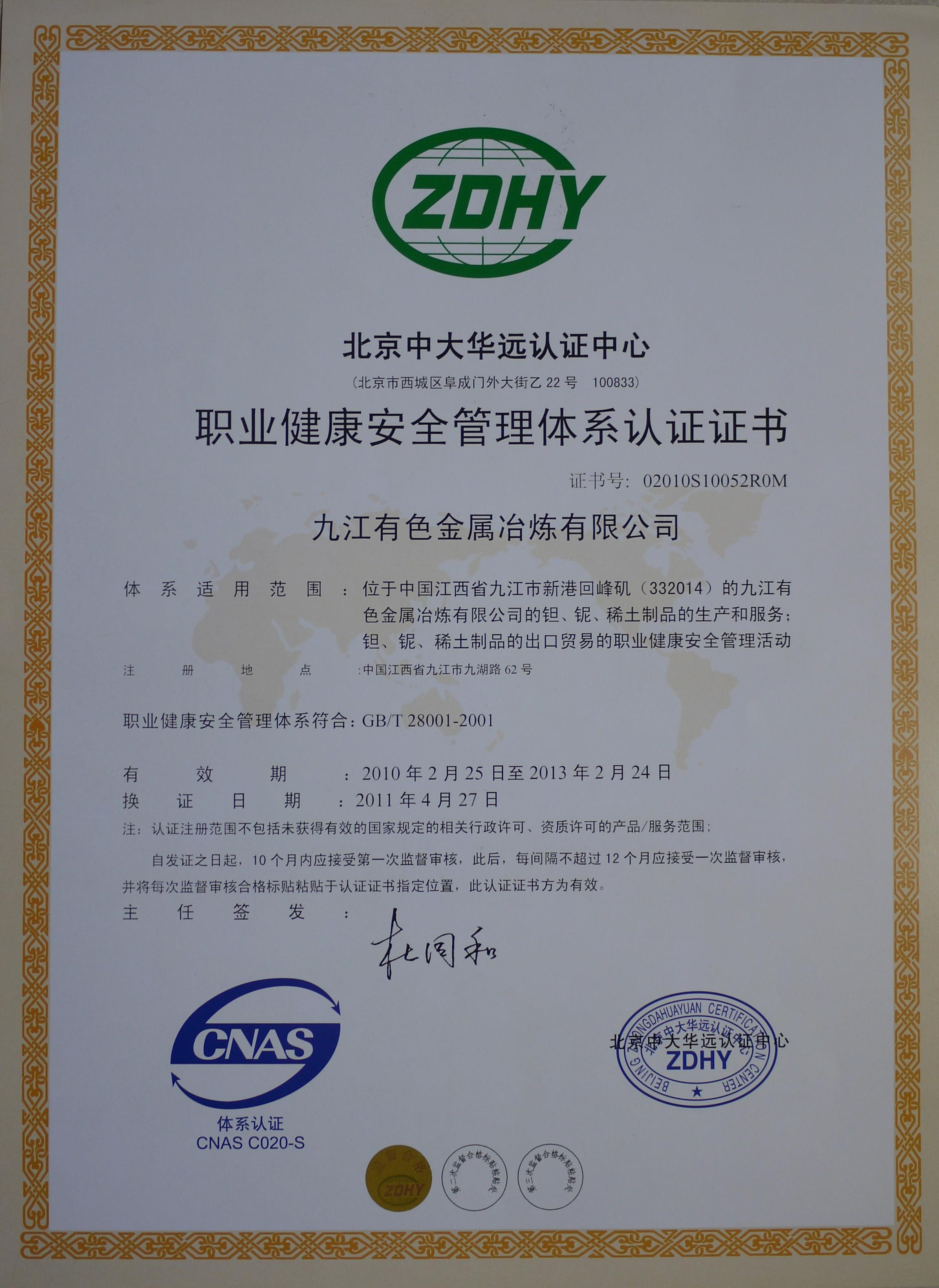 职业健康安全管理体系认证证书