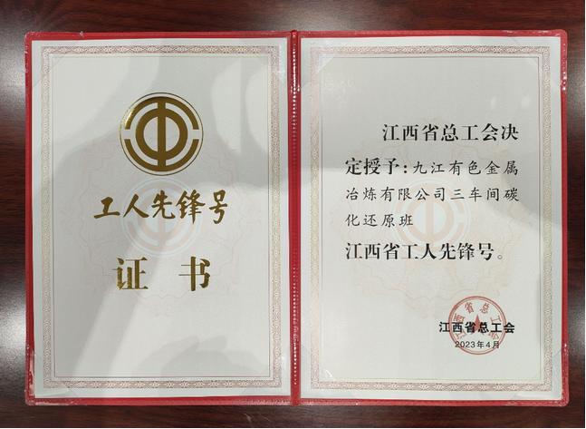 九冶公司三车间碳化还原班获“江西省工人先锋号”荣誉称号