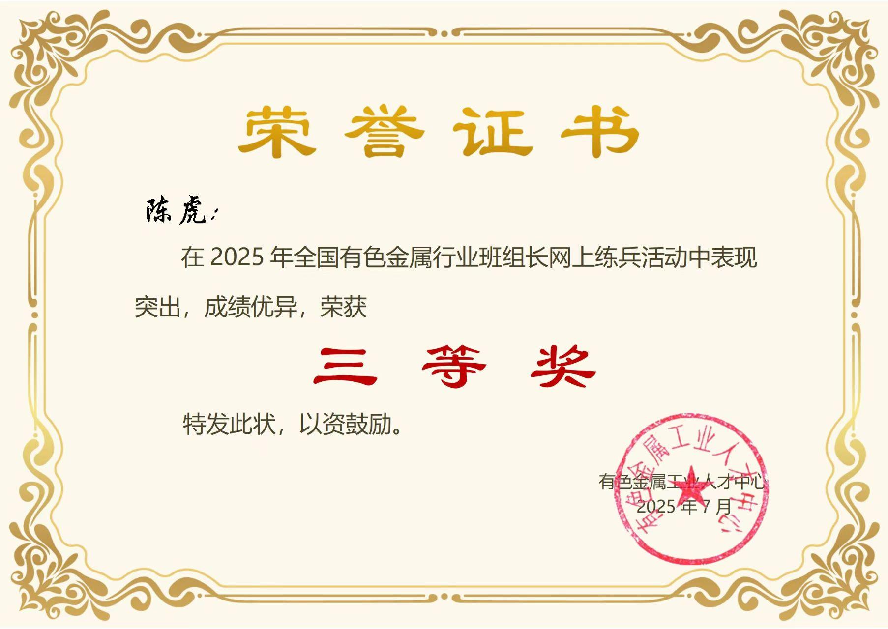 陈虎同志在全国有色金属行业班组长 网上练兵活动中荣获佳绩