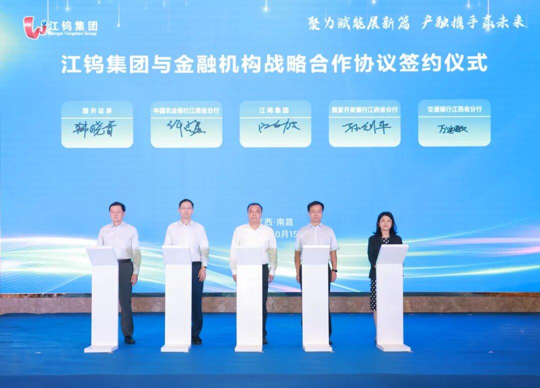 10月15日,江钨控股集团与金融机构战略合作暨江钨矿业基金设立签约仪式在南昌举行。江西省国资委党委书记、主任肖云出席仪式并见证签约。